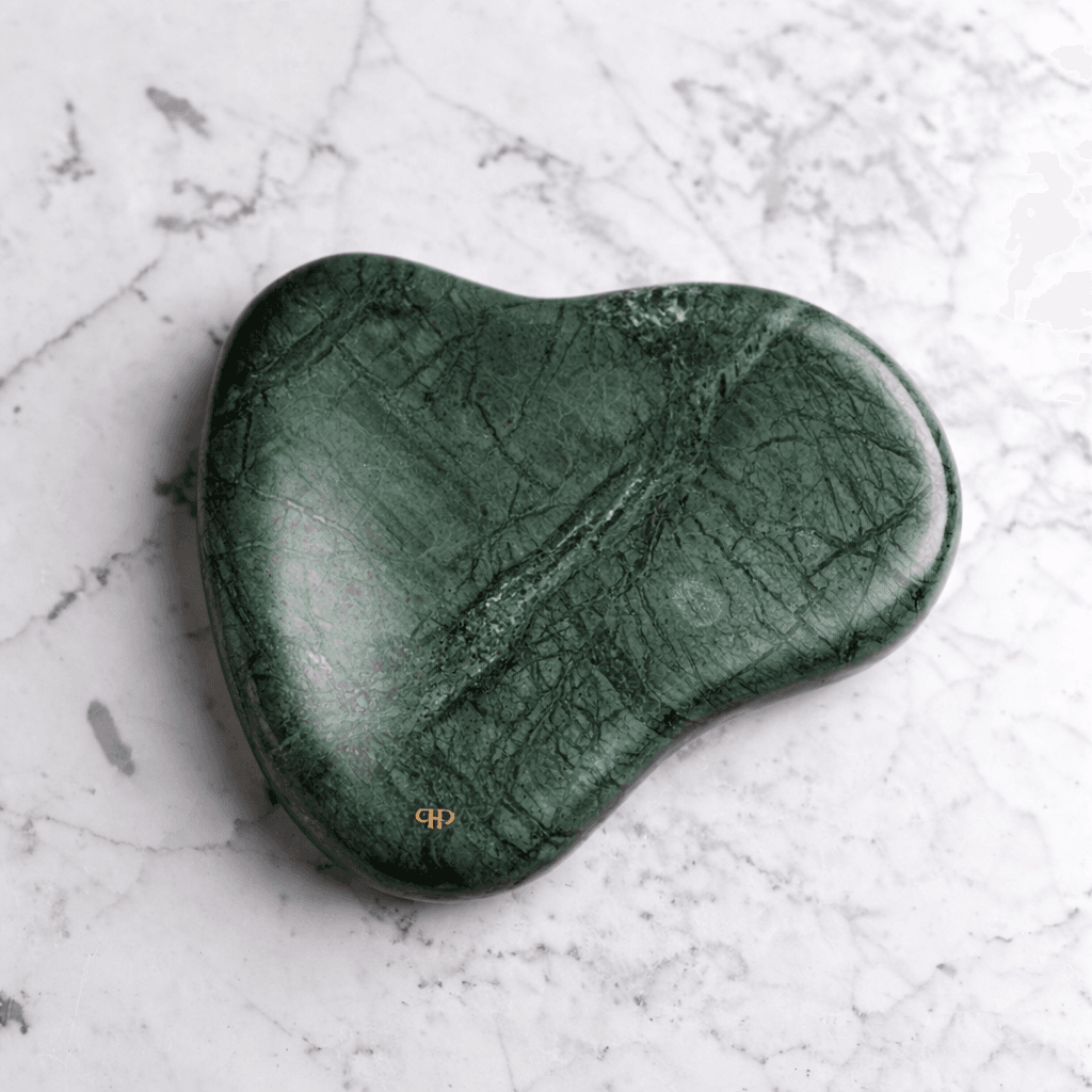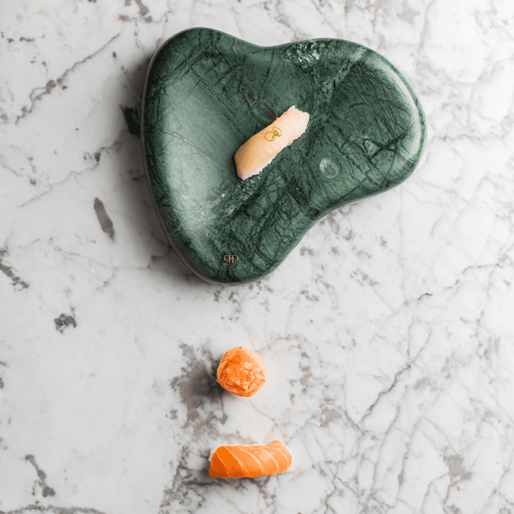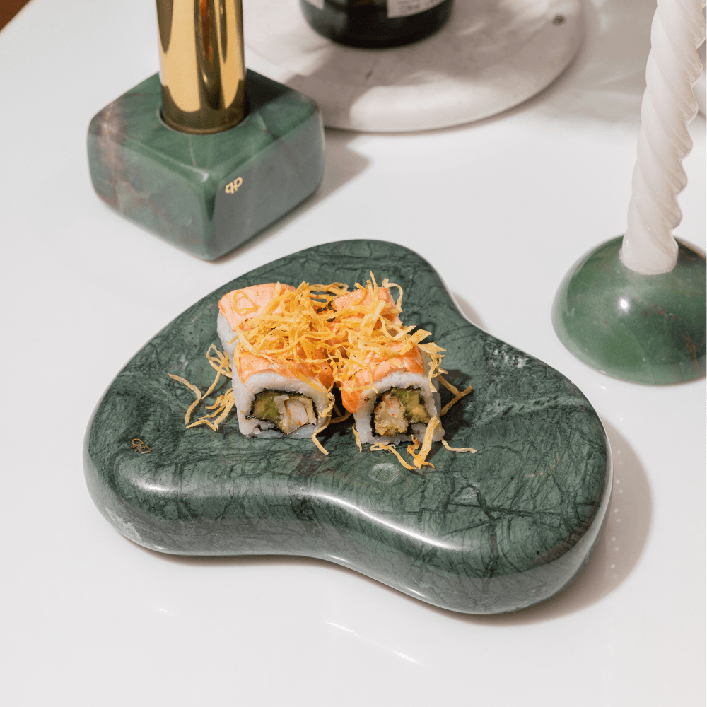 O Adorno Le Iris foi desenvolvido em formato orgânico, desenhado à mão pelas mulheres da Le Iris e moldado um por um para produzir essa forma orgânica, única e exclusiva. Desenvolvida no Mármore Verde Guatemala, o Adorno traduz o conceito de valorização das formas na sua forma mais orgânica e pura. Além disso, tem um processo produtivo artesanal e atento a cada detalhe, podendo levar até seis horas para polir uma única peça.