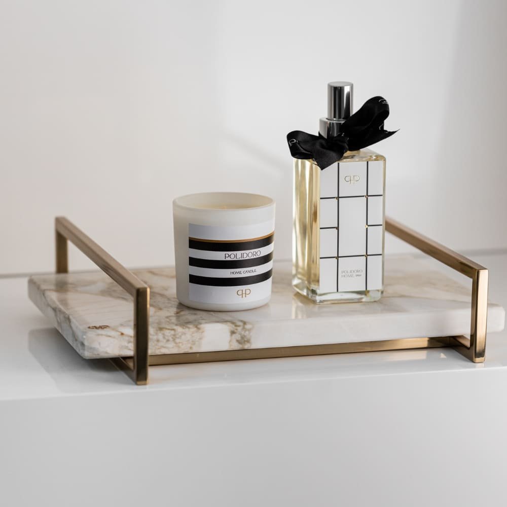 Um objeto de arte. A Bandeja Giverny é realmente uma obra de arte. O design elegante, autoral e exclusivo, os metais trabalhados e a qualidade dos materias são as principais características que a fazem receber tal título. Desenvolvida no Mármore Calacata Gold e com detalhe em metal aço inox dourado, é uma peça feita para ser eterna e passar de geração para geração.
