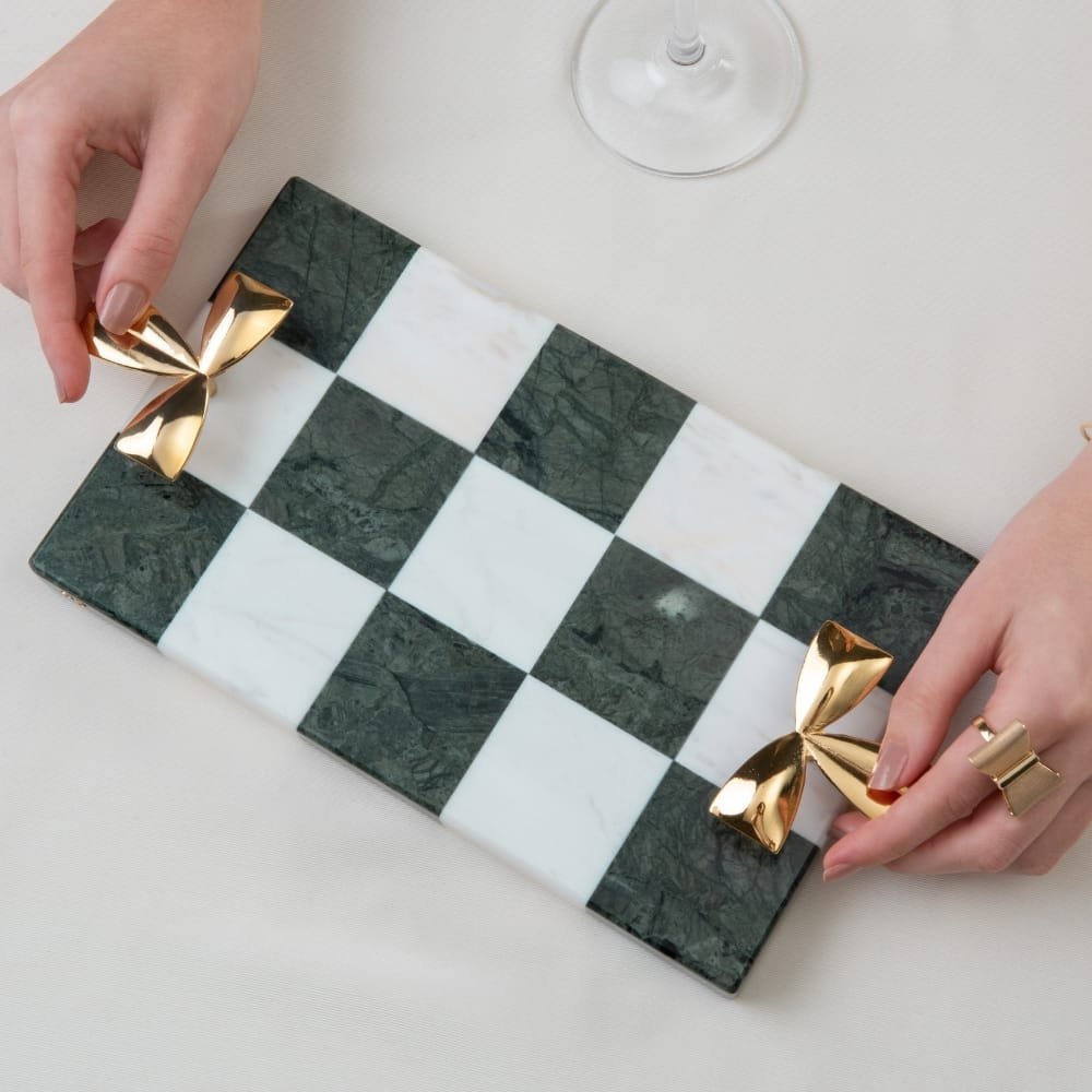A Bandeja Quadriculada P nasce do encontro entre dois mármores de presença marcante Branco Paraná e Verde Guatemala.