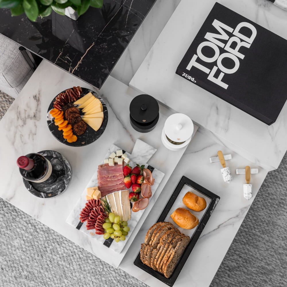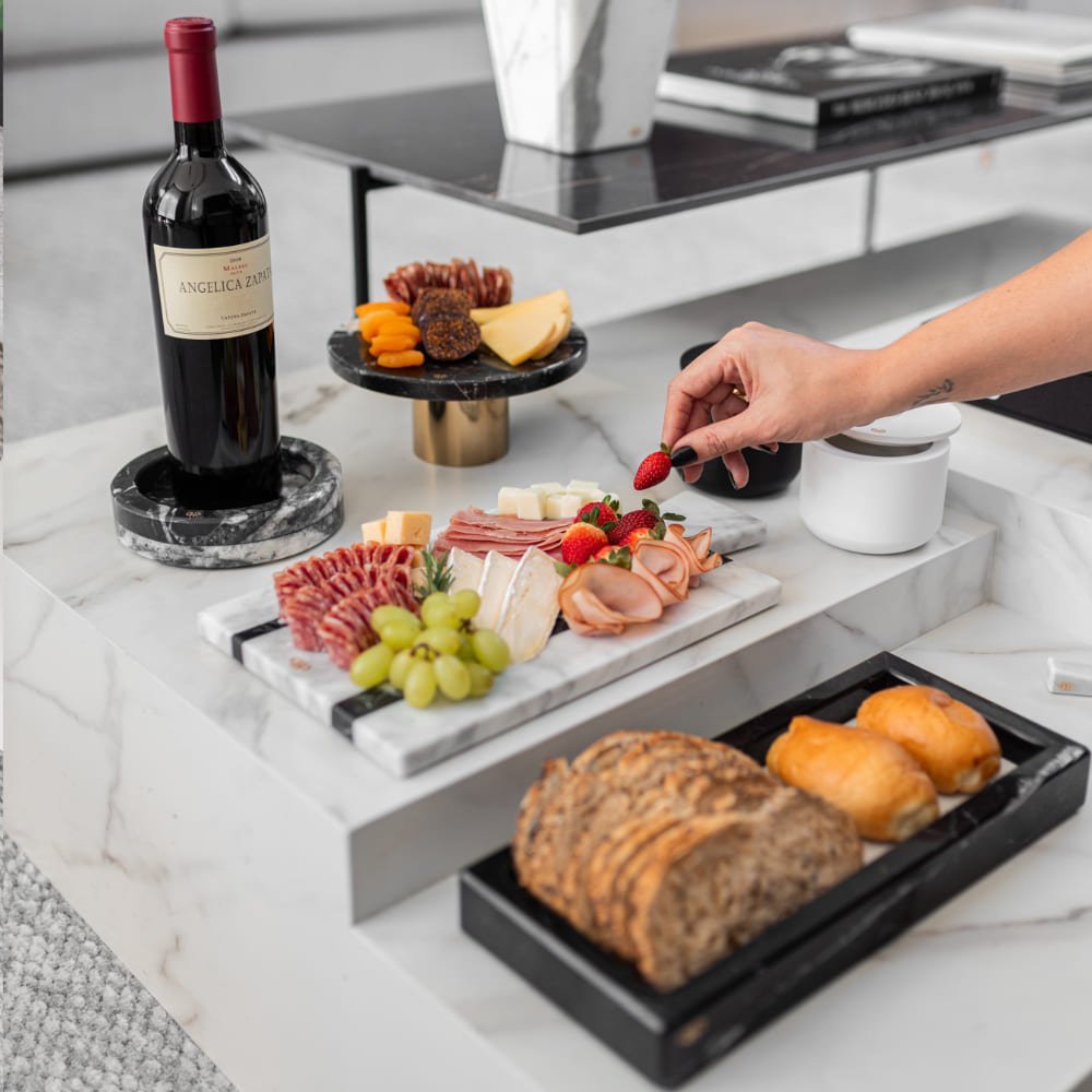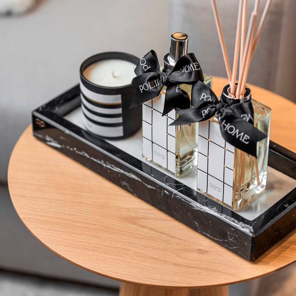 Prática e elegante, a Bandeja Marais é desenvolvida no Mármore Nero Marquina com fundo no Mármore Carrara e tem o tamanho perfeito para ser uma peça versátil e estar presente em diversos ambientes e momentos especiais. Você pode usá-la  em mesas de aperitivos, na organização de aparadores, mesas de cabeceira, penteadeira e lavabo.