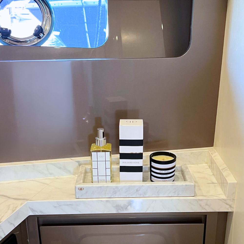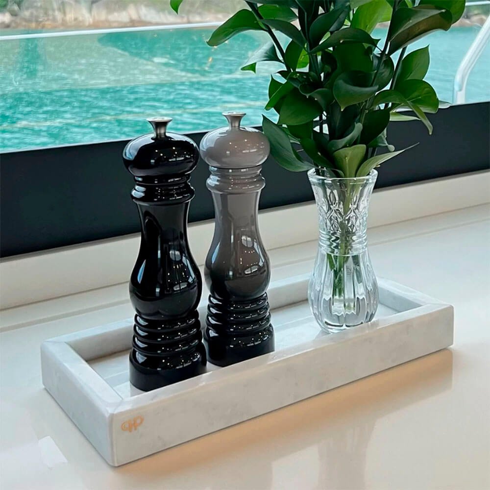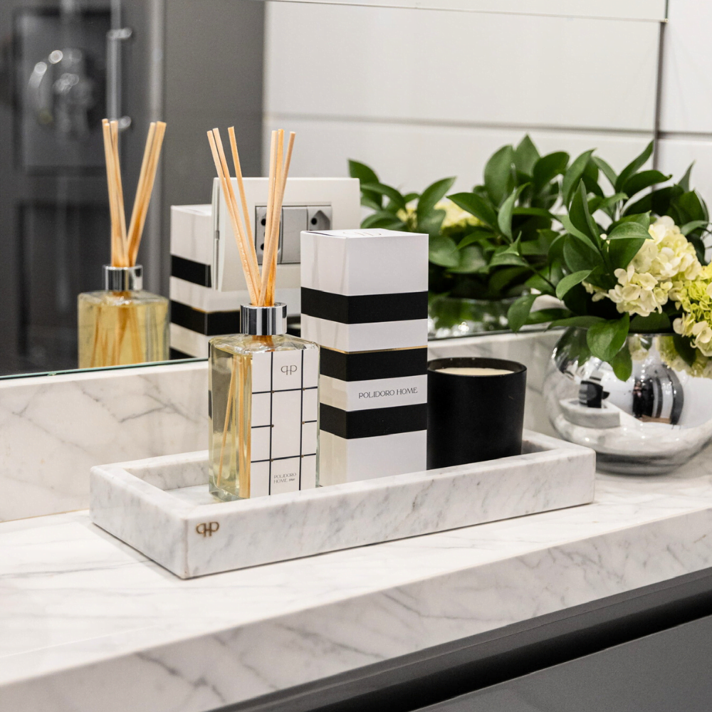 Prática e elegante, a Bandeja Marais é desenvolvida no Mármore Carrara e tem o tamanho perfeito para ser uma peça versátil e estar presente em diversos ambientes e momentos especiais. Você pode usá-la em mesas de aperitivos, na organização de aparadores, mesas de cabeceira, penteadeira e lavabo.