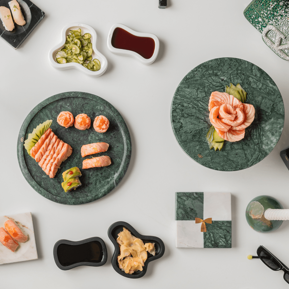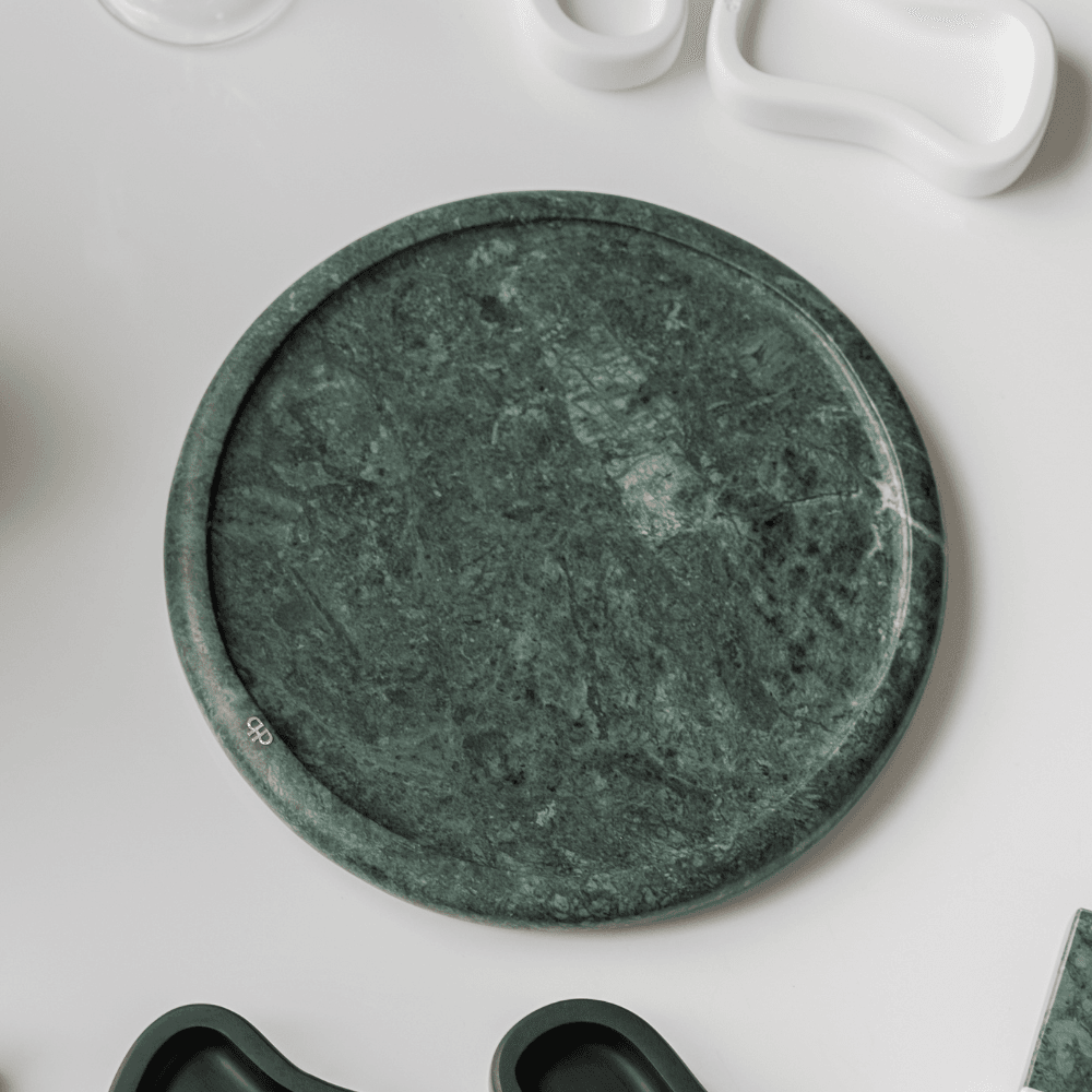 A bandeja Momentos em mármore Verde Guatemala traz modernidade à sua mesa, com um toque único de exclusividade.