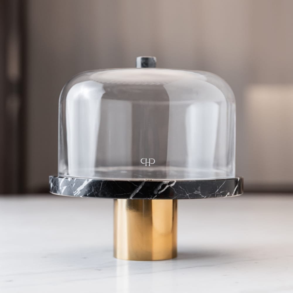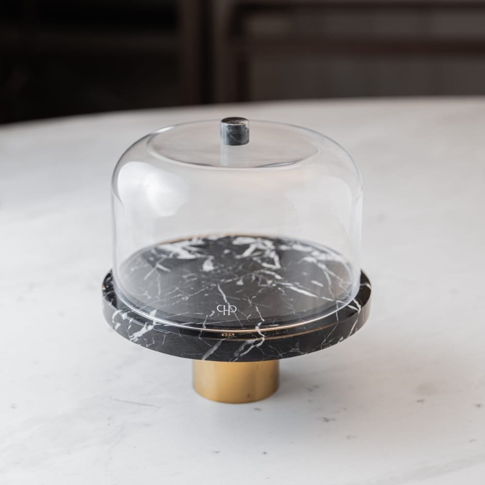 Descubra a Boleira Petit Mármore Nero Marquina com base dourada da Polidoro Home. Sofisticação em pedra natural para momentos especiais.