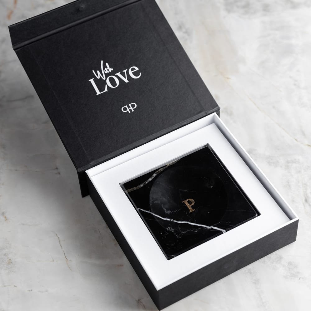 Caixa de presente: Exterior em preto com um berço interno branco.