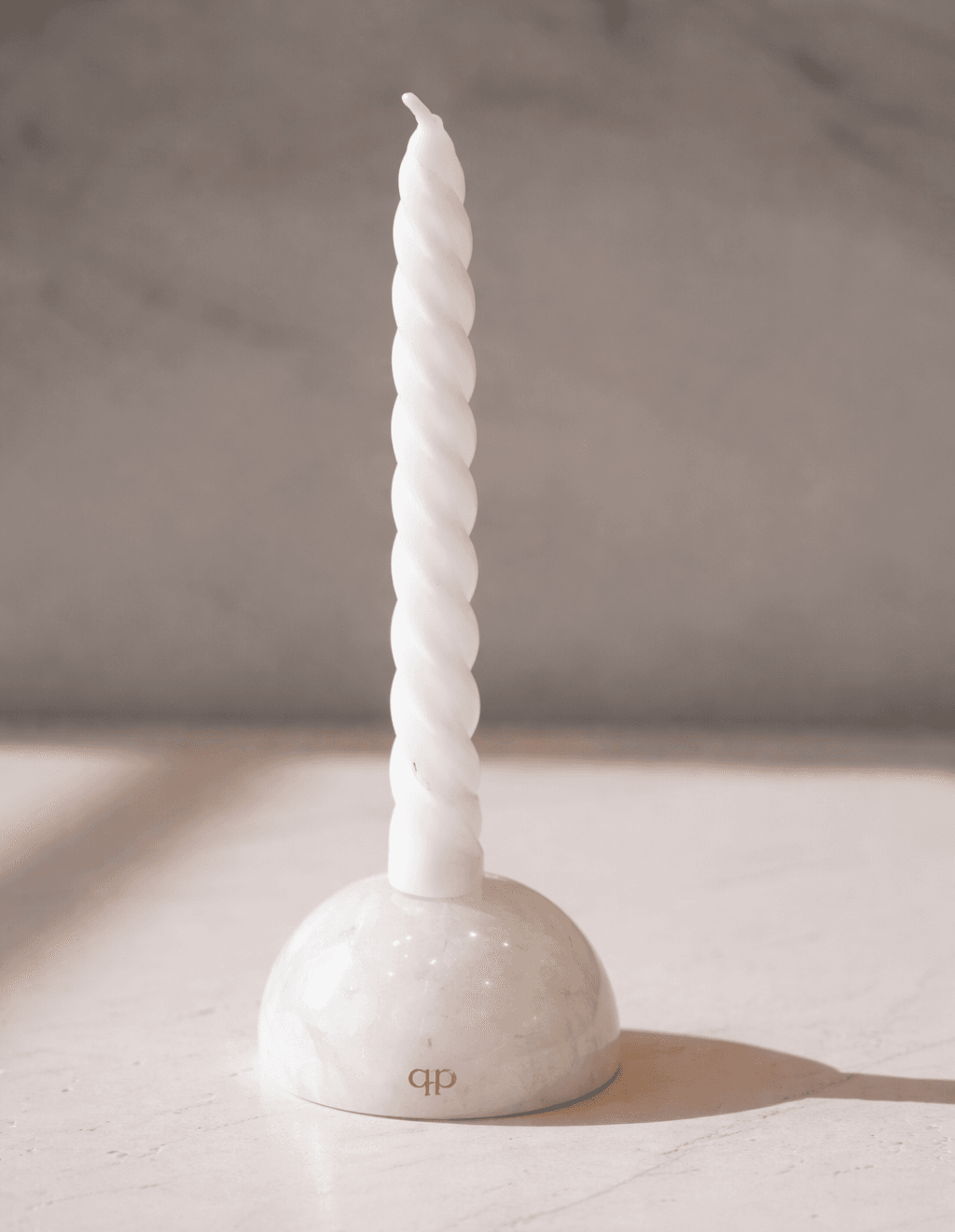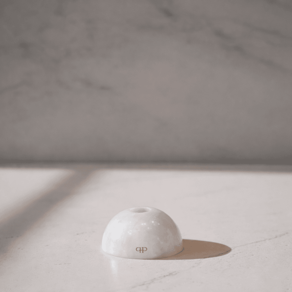 O Castiçal Energy une a solidez da pedra natural ao design minimalista. Esculpida em quartzo branco no formato de meia esfera, a peça destaca a beleza bruta e as variações únicas de tons e veios do cristal.
