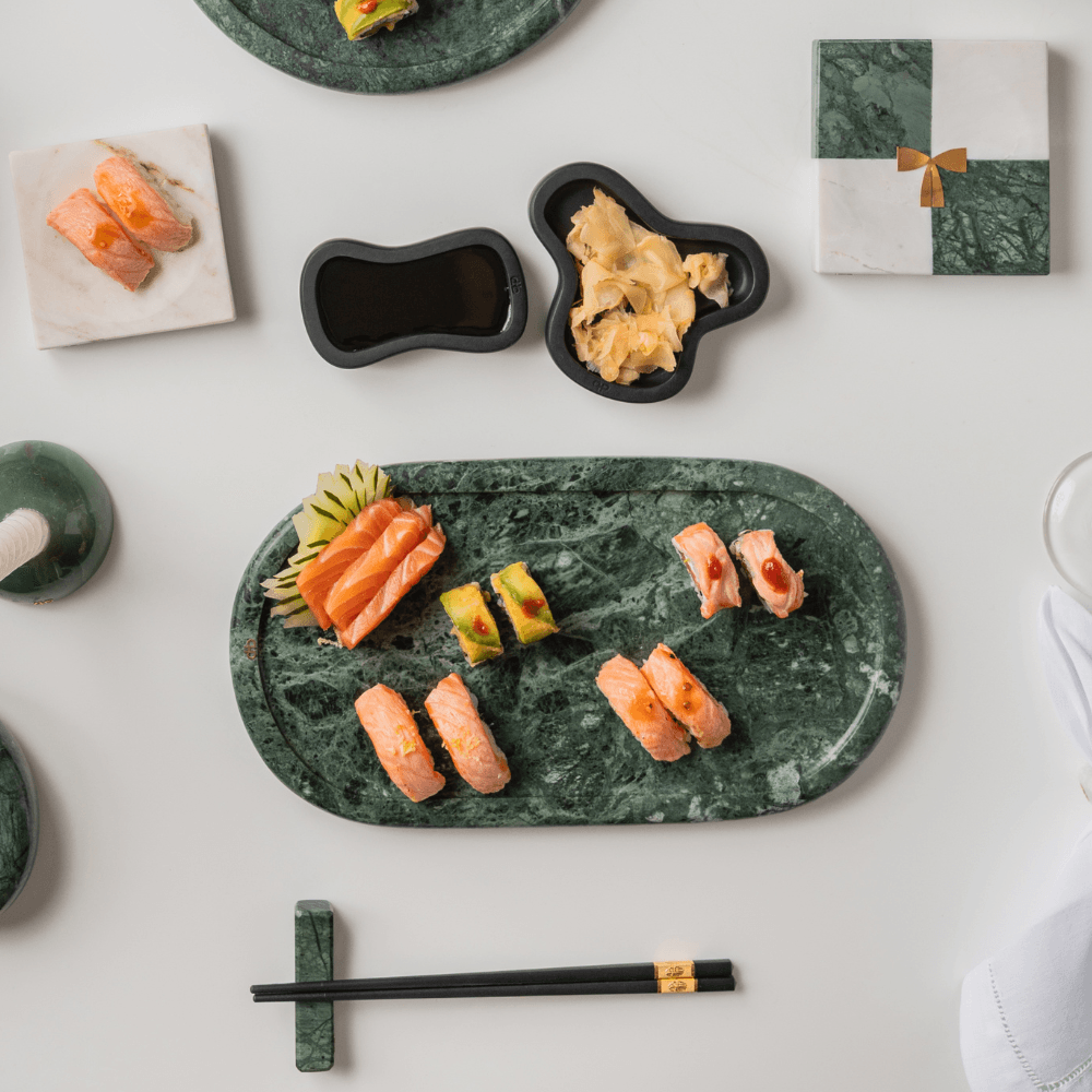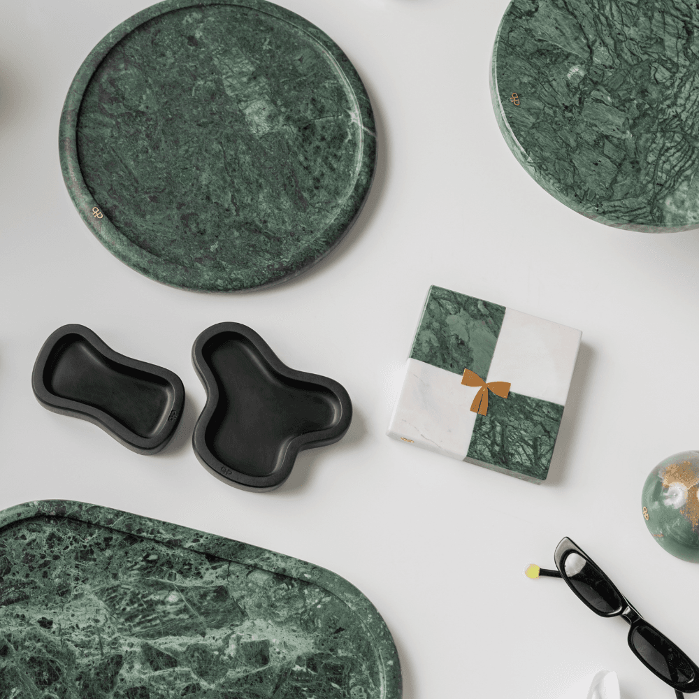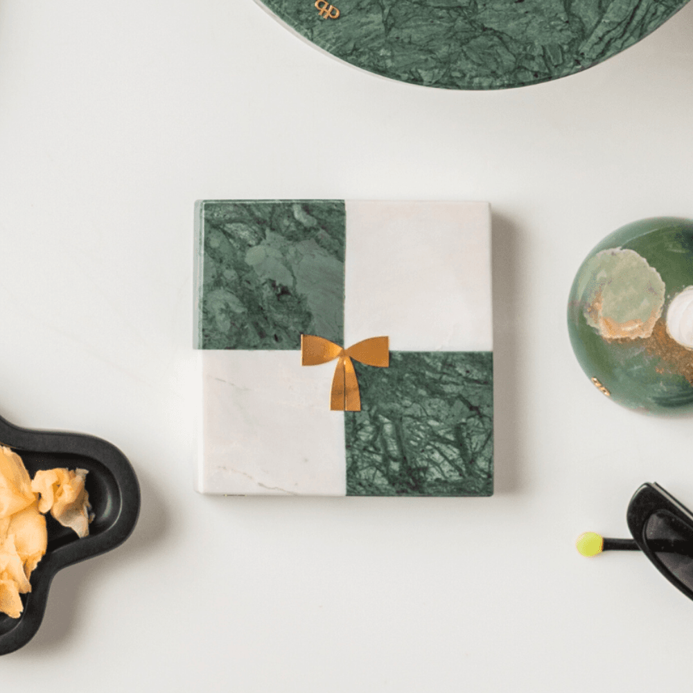 Esculpido em Branco Paraná e Verde Guatemala, ele combina o rigor geométrico do quadriculado com a delicadeza do laço central, elemento que traduz a sensibilidade e a assinatura criativa da coleção. Uma peça versátil, podendo ser utilizada à mesa para embelezar, servir petiscos, ou em aparadores. Uma peça que passeia por toda a casa.
