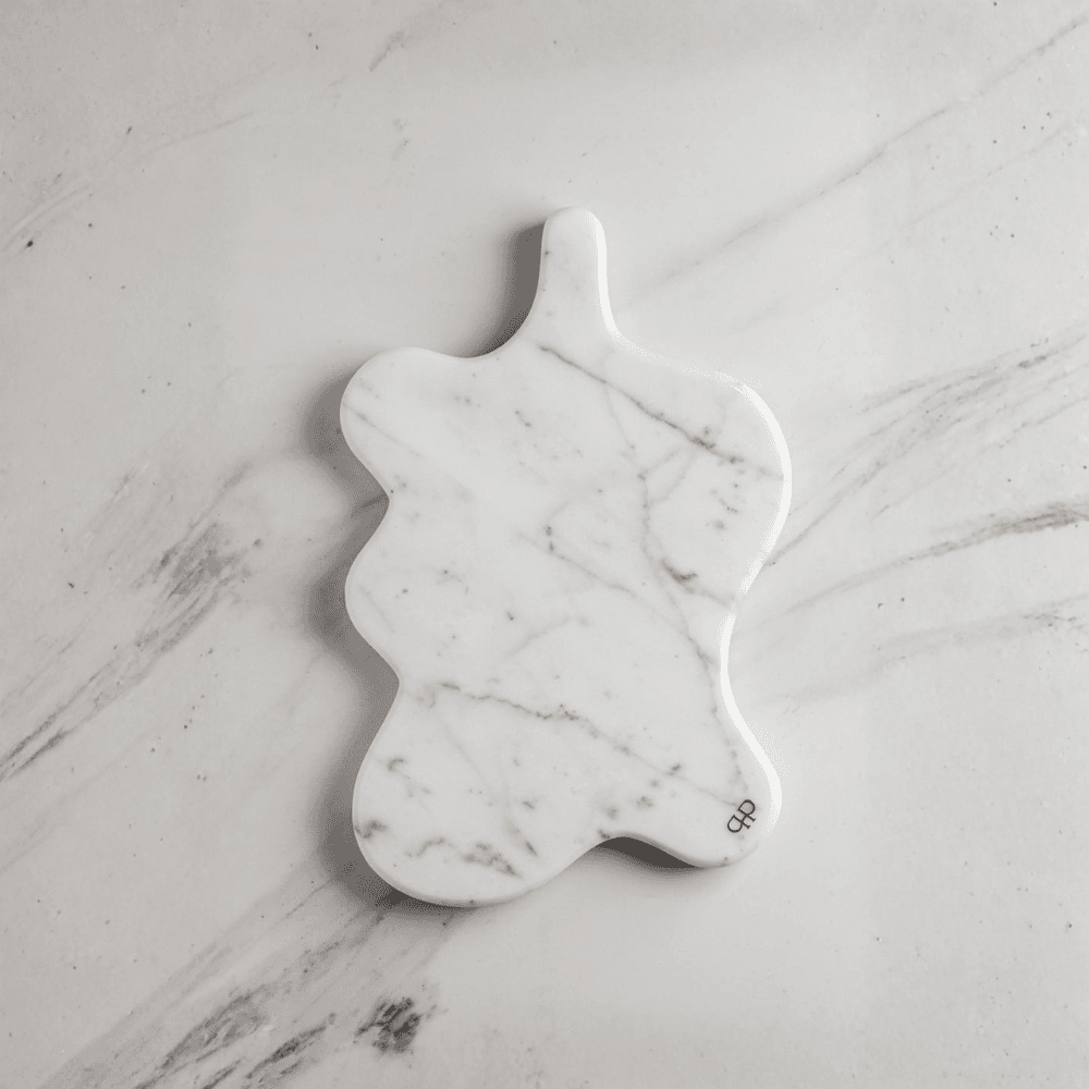 Tábua desenvolvida em mármore Carrara, desenhada à mão. Tanto à mesa de jantar ou de aperitivos, ela é maravilhosa para compor a decoração do ambiente. É uma peça versátil que passeia por toda a casa.